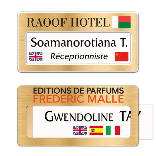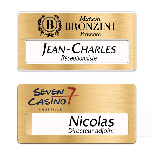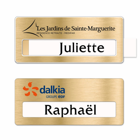 Badge aluminium Or brossé à insert - Double Lignes - 7 x 3,5 cm