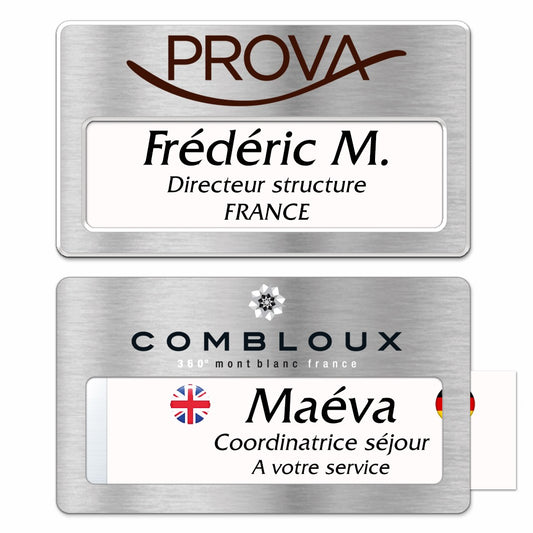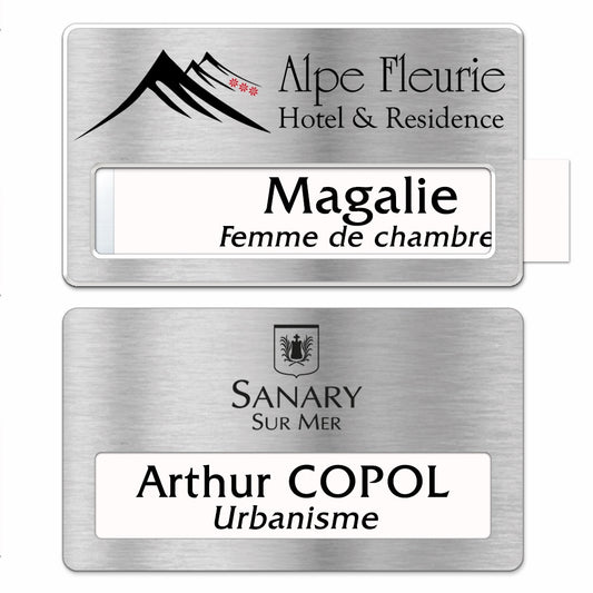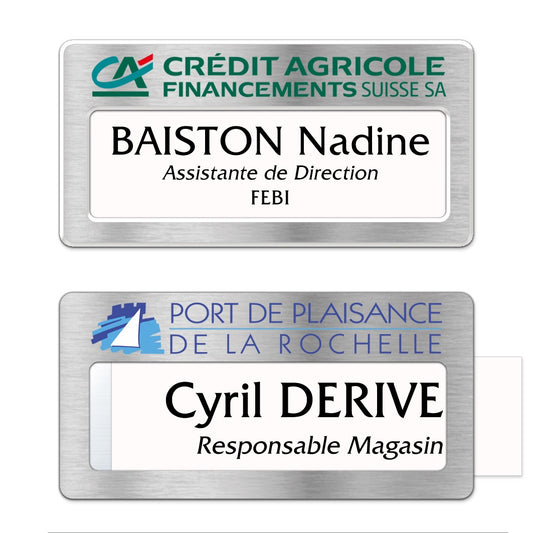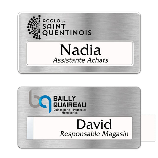 Badge aluminium argent Brossé à insert - Double Lignes - 7 x 4 cm
