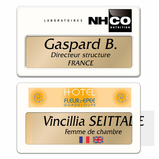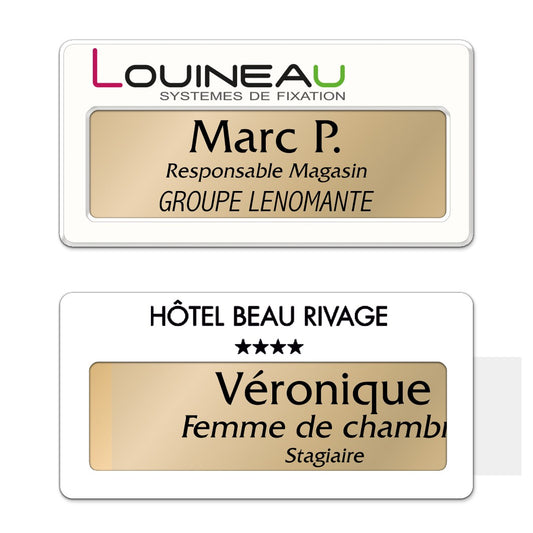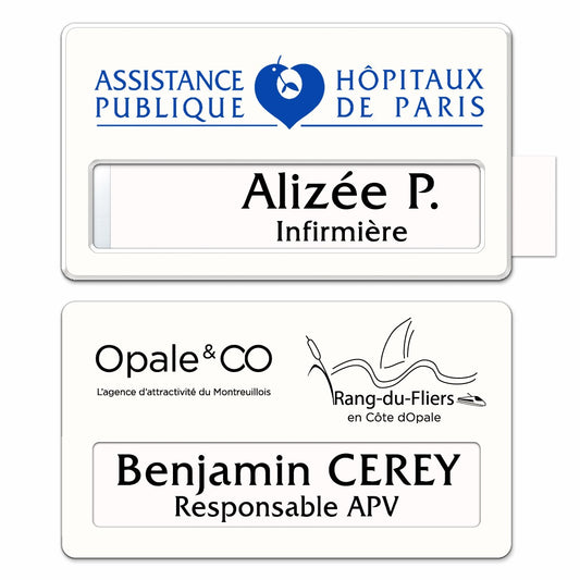 Badge aluminium Laqué Blanc à insert - Double Lignes - 7 x 3,5 cm